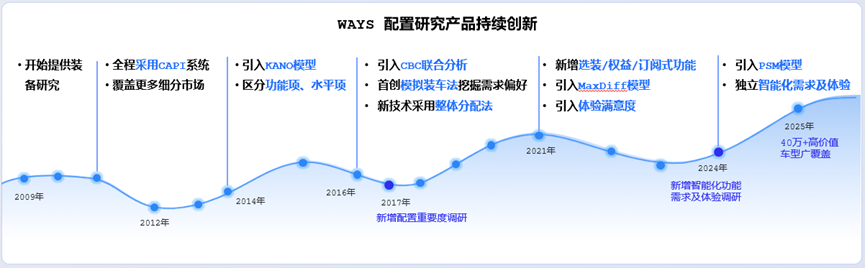 从2009年开始,威尔森每年都会持续开展汽车配置研究,现已累计16年配置调研经验,拥有超过12万消费者样本库。