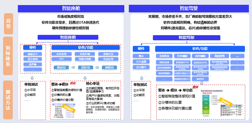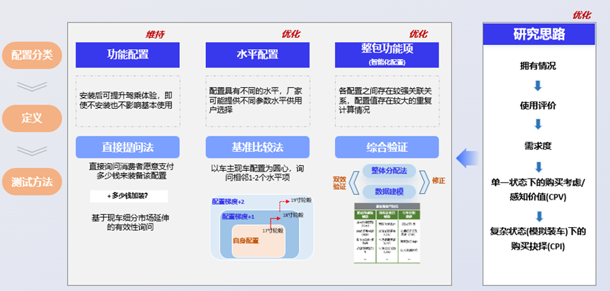 针对不同的配置类型,我们采用对应的研究方法,使配置感知能完美契合用户购车决策路径。面向存在较强关联的特殊配置如智能座舱和智能驾驶,为呈现整体性,采用整包分配法和数据建模进行双向验证。