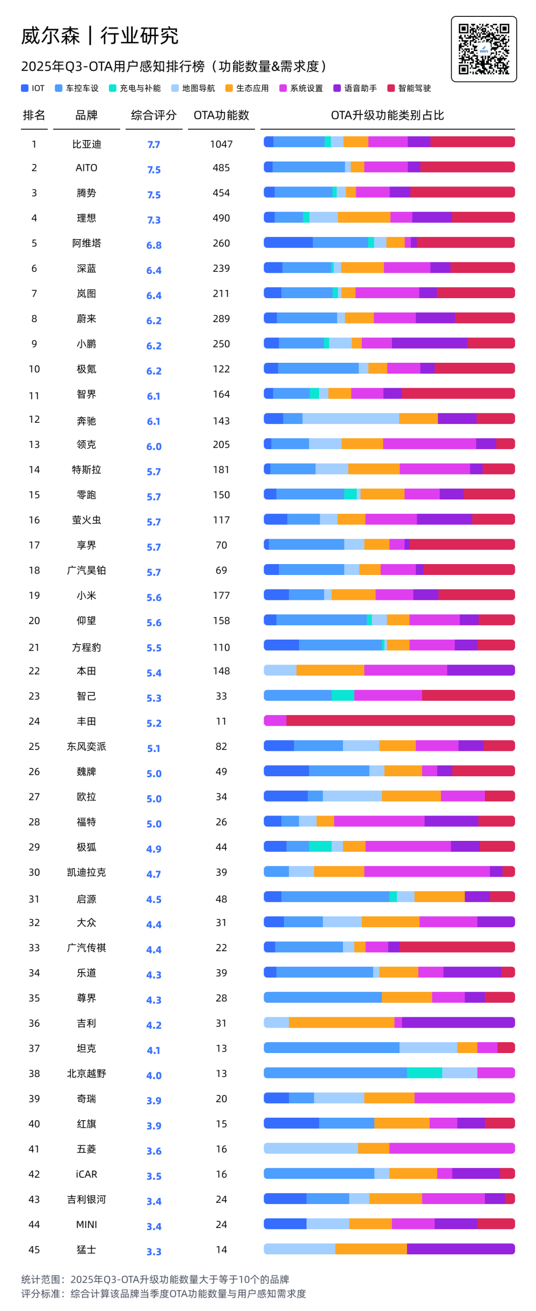 2025年Q3,中国市场共有53个品牌,173款车型,发布并升级了249个OTA版本迭代,共涉及智能座舱、IOT、充电与补能、车设车控等八大领域,3690项功能升级(含新增/开放/优化)。