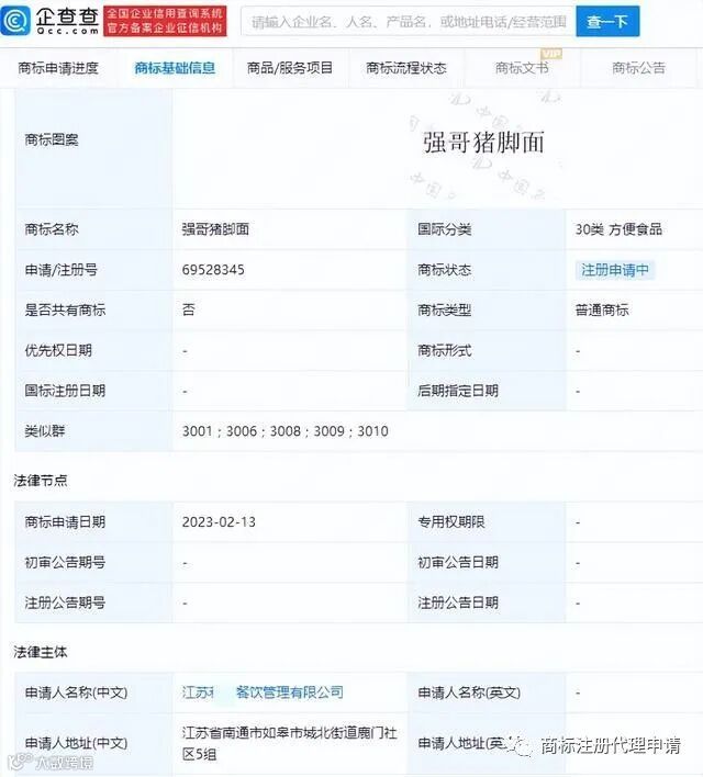 近日,“强哥猪脚面”“阿强猪脚面”商标正在注册申请中,国际分类含30类方便食品、16类办公用品、43类餐饮住宿。