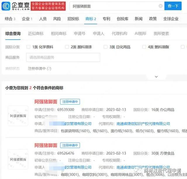 商标注册代理申请近日,“强哥猪脚面”“阿强猪脚面”商标正在注册申请中,国际分类含30类方便食品、16类办公用品、43类餐饮住宿。