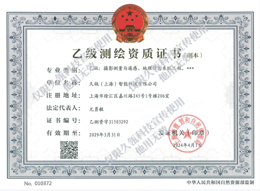 测绘资质的获得是久瓴科技发展历程中的重要一步,也是我们持续深化数字资产产业链布局、服务社会经济高质量发展的有力证明。