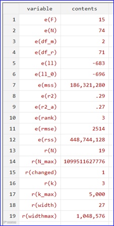 sysuse auto.dta, clearreg price mpg weight, vce(robust) frame create new frame new: svret, long format(%8.2g) type(scalars) frame new: br
