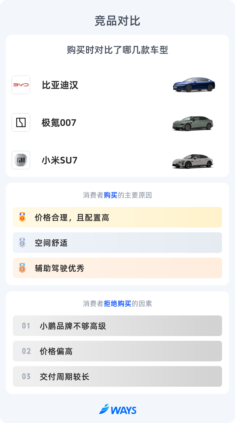 价格同时出现在购买和不购买的因素里,源于认为P7+价格偏贵的人,很多是零跑、比亚迪10-15万元价位车型的潜客,他们“踮一下”脚尖能购买P7+,但这部分买家最终容易因超预算而没有选择购买P7+。