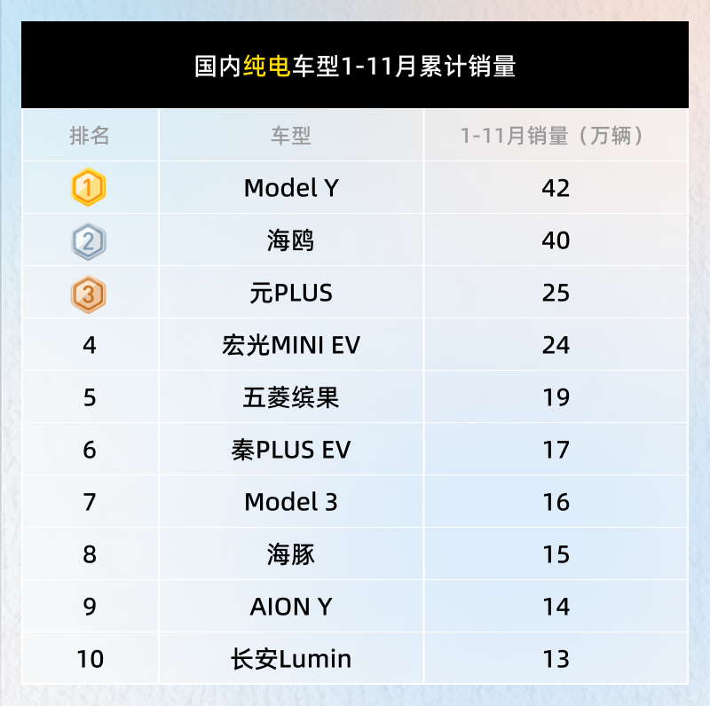尽管纯电销量还是占新能源过半份额,但我们看一下纯电车销量TOP10排行。