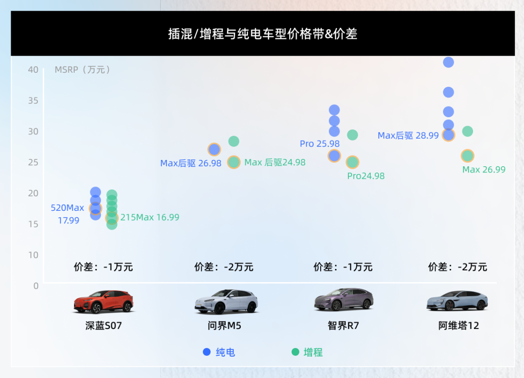 我们再看目前一些车型增程版和纯电版的价差,增程版普遍比纯电版便宜1万元以上。