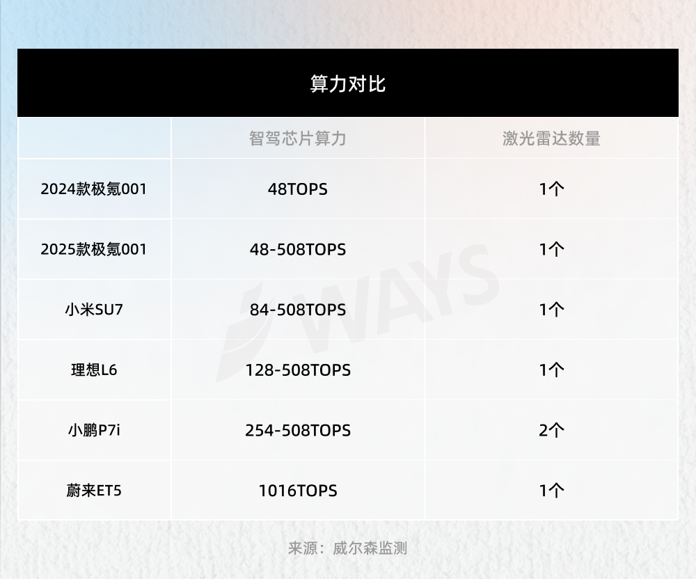 不过2024款极氪001还是保留了一处“破绽”,即便此次新增了激光雷达,但智驾芯片依旧延续2023款的Mobileye Q5H,单颗芯片算力只有24TOPS,两颗加起来也仅有48TOPS。