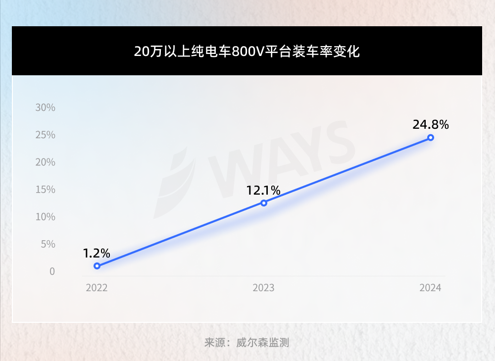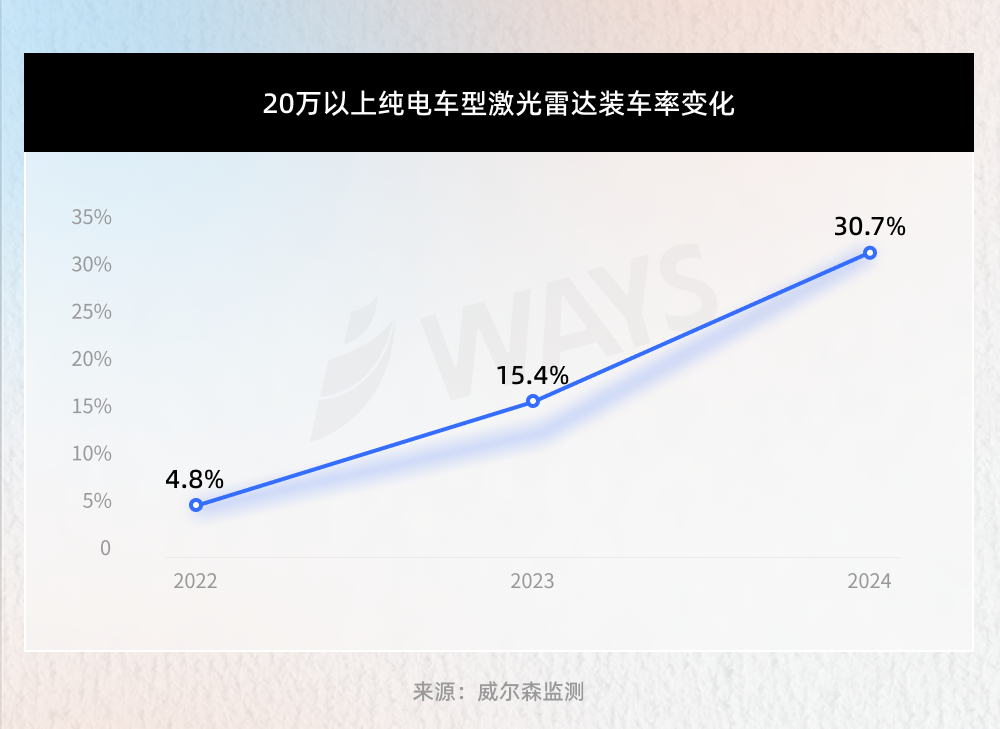 去到今年,800V在20万以上纯电车的装车率已达到24.8%,激光雷达装车率达到30.7%。