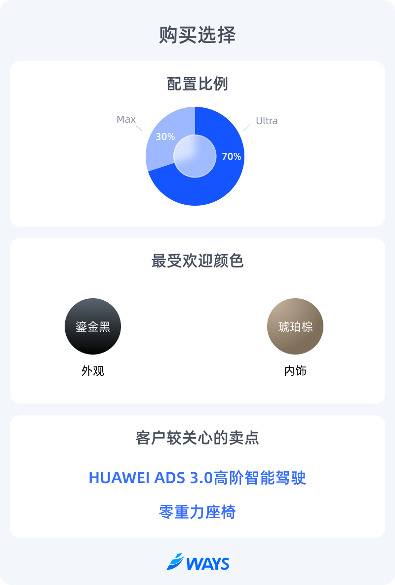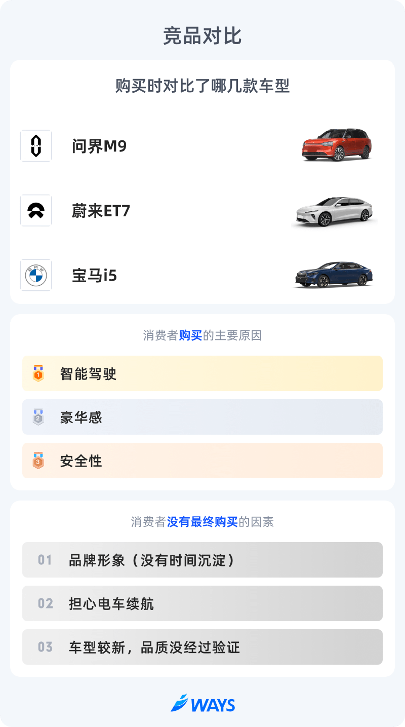 增购用户家里车型会以BBA的56E为主,客户的出发点是习惯了驾驶这个尺寸的轿车,现在想开智能电车换一下口味。BBA里找不到较好的选择,于是便看上同级别的享界S9。