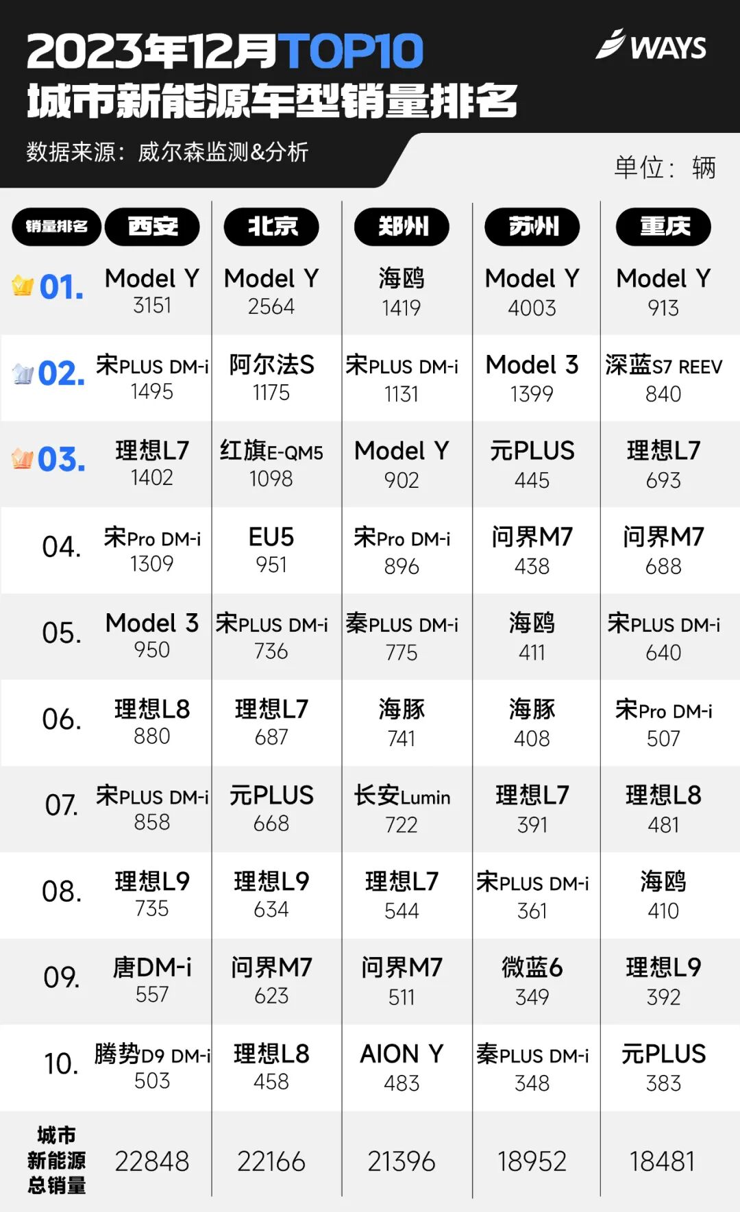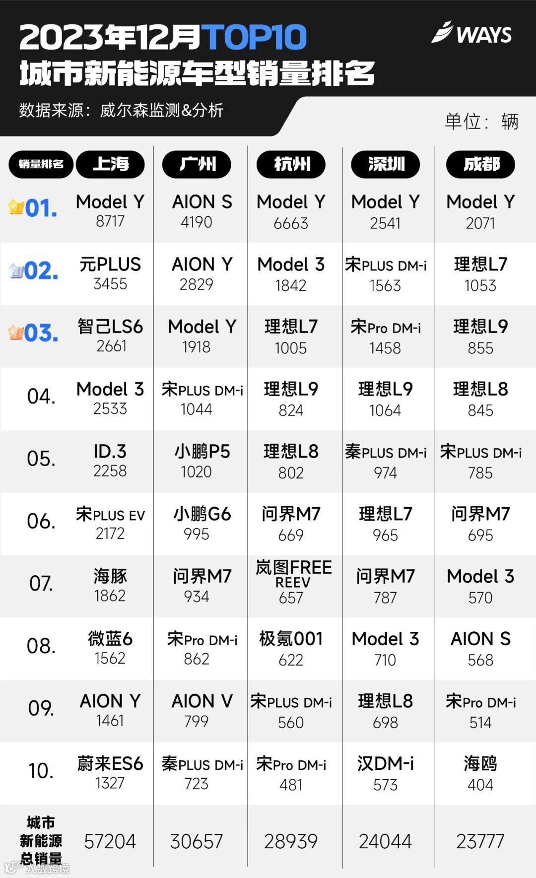 其实,这种“错觉”大多源于“宏观”的全国销量,在众多“微观”层面的城市销量组合中,每个城市的不同消费者对车型之间的购买偏好,差异真的非常大。以下是我们对2023年12月新能源销量TOP10城市中,选取的各自TOP10销量车型,从中发现不少有趣的现象。