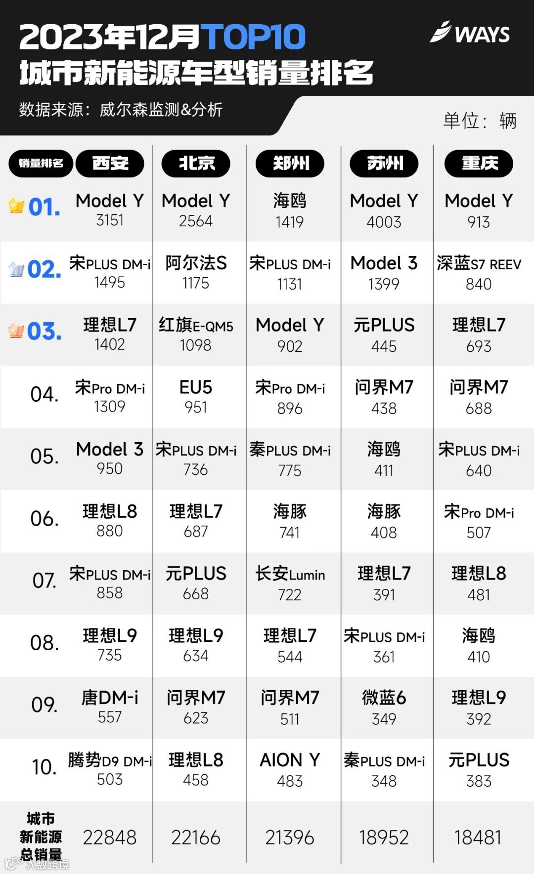 在西安TOP10销量榜中,我们看到腾势D9 DM-i的身影,这款车就是在比亚迪西安工厂生产的。还有北京,我们看到极狐阿尔法S和北汽EU5的身影,这两款车都有北汽背景,极狐阿尔法S在12月全国销量仅有2000多辆,但在北京却能排到前十。