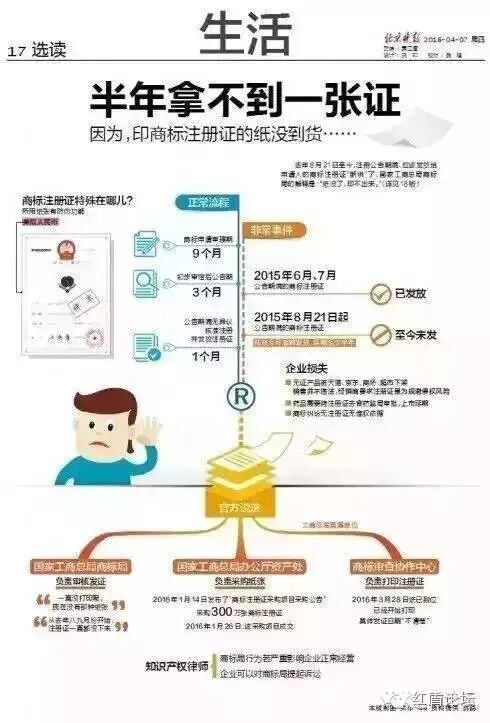 余恒告诉北京晚报记者:“如果没有证,我去地方工商局投诉别人侵犯我商标权,但是因为商标局没纸了所以我现在拿不出注册证来,大部分地方都会很教条地说,那就等证发下来再来投诉吧。但是维权可能是迫在眉睫的,我做商标维权这么多年,很多时候都是两三天之内证据必须提交上去的。现在商标局这样的行为,可以说是对企业的品牌保护造成了非常严重的影响。”(北京晚报)