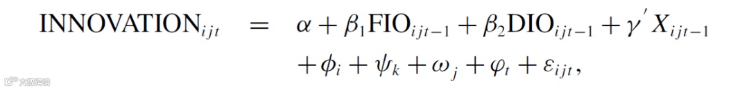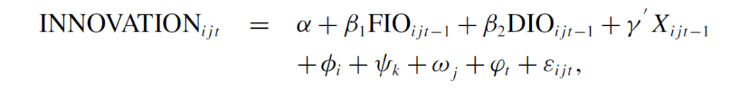 本文选取了26个非美国经济体2000-2010年的数据,使用DWPI数据库中公司层面的专利申请和引用数据测度企业的创新水平。为了缓解专利申请和引用数据存在的截尾问题,作者对这两个指标都使用了专利所属技术类别的均值进行调整;为了缓解专利数据分布的右偏问题,作者对这两个指标都取自然对数。本文的机构持股数据来自于FactSet数据库,财务数据来自于Worldscope数据库。作者构建了如下模型检验境外机构投资者对企业创新水平的影响:
