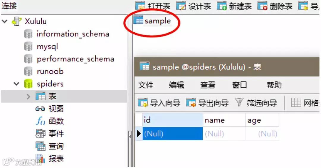 值得注意的是,创建新表的时候必须指定数据库,所以在连接的时候必须再额外指定一个参数db='spiders'。打开MySQL,我们发现sample表确实被成功创建了: