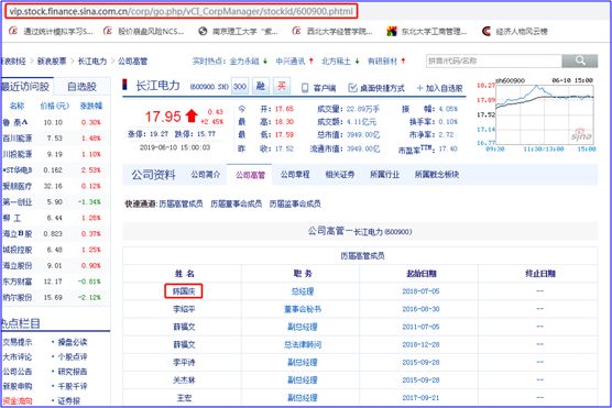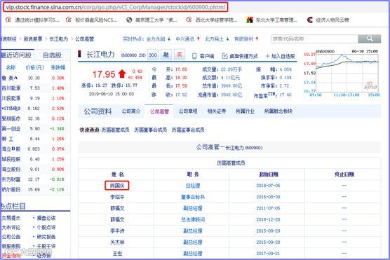 我们首先获得一个公司的高管信息,在此以长江电力(股票代码:600900)为例,逐步给大家介绍如何获得任职信息。