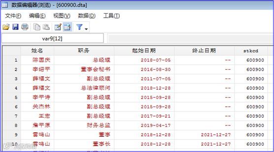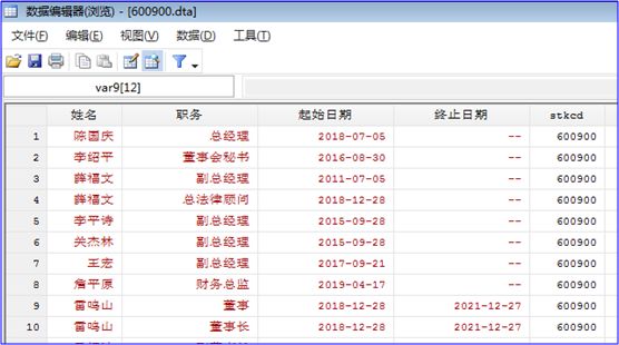 rename _all (姓名 职务 起始日期 终止日期)gen stkcd = 600900save "600900.dta", replace