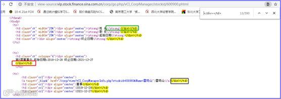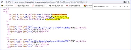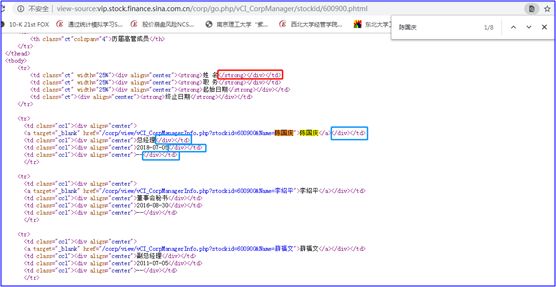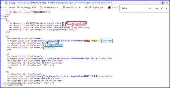 在整个页面中,“陈国庆”出现了8次,注意蓝色方框,所在行依次显示:姓名、职务、起始日期、终止日期,这些是我们需要的信息。红色方框所在的行,是大标题(粗体,有“</strong>”这个HTML标签),这是我们不需要的信息,我们来看如下这两个截图: