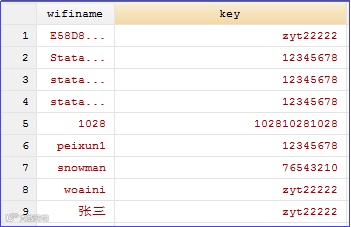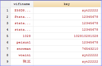 rename v* (wifiname key) //将v和v1重命名为wifiname和key,结果如下(部分截取)。