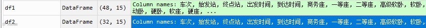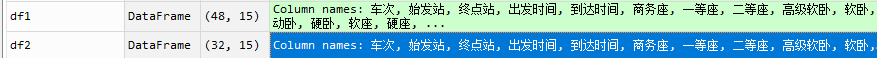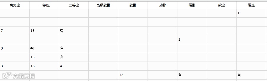 | (df1.软座!="") |(df1.硬座!="") | (df1.无座!="") ].reset_index(drop=True)# #保留有做的席位并重置索引