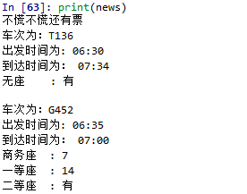 news=news+"\n"+"车次为:"+df2.ix[i,0]+"\n"+"出发时间为: "+df2.ix[i,3]+"\n"+"到达时间为: "+df2.ix[i,4]+"\n"