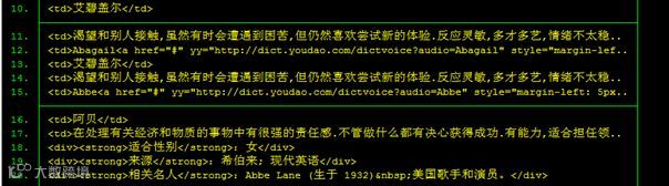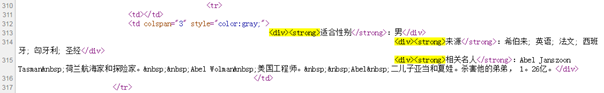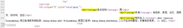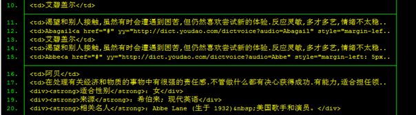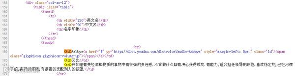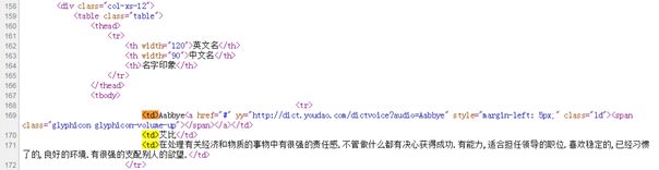 其次,进一步分析发现,“<tr>…</tr>”是1对行标识符,该标记中的内容显示在同一行。每对行标识符之间有3对列标识符“<td>...</td>”,该标记中的内容显示在同一列,即每行包括3列信息。在英文名下面,有时也另起一行,加入1-3对强调符“<div><strong>...</strong>...</div> ”,说明该英文名的适合性别、来源及相关名人。在表格符“ <table>...</table> ”之间正好出现60对列标识符“ <td>...</td> ”和部分强调符“<div><strong>...</strong>...</div> ”,即是我们需要提取的20行英文名、中文名、名字印象及相关注释等表格信息。同时,以上两对符号也仅存在于表格符之间。
