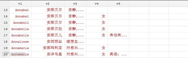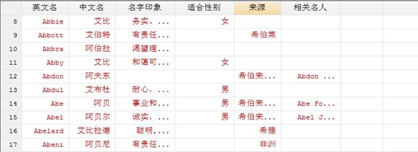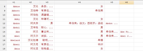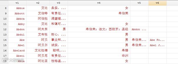 由于部分页面的英文名可能含有少于6项信息,如字母“A”下的第14页。在初步处理之后,数据如下: