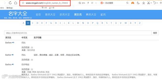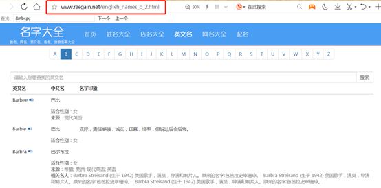 在进行网页抓取之前,我们首先观察网页链接的变化规律。我们发现,点击不同的字母和页码,网页链接的开头部分http://www.resgain.net/english_names并不发生变化,只有后半部分的首字母和页码会改变。在网页源代码中,也可查看我们需要抓取的信息。因此,我们可通过copy命令,改变网页链接中的首字母和页码信息来循环抓取这个页面。