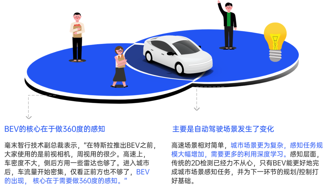 BEV改进了自动驾驶看物理世界的视角,从传统的2D为主的图像数据,转化为3D坐标空间下的数据。特斯拉的做法大致是:基于纯视觉,用8个摄像头采集数据,通过深度学习的主干网络Backbone对各个摄像头进行特征提取,再通过Transformer将2D图像转化为3D空间。通过BEV和Transformer,特斯拉开始获得全新的“上帝视角”下的数据,并在此基础上为数据加上了时间戳,形成了4D空间,以用于对目标物测速,目标物运动轨迹的预测。