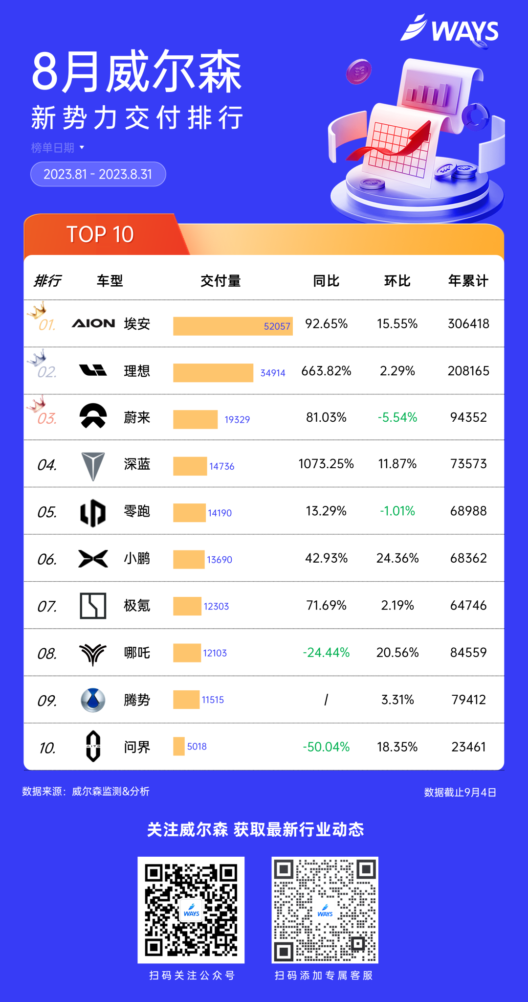 总体来看,今年新势力的整体势头仍然快速向前发展。根据威尔森监测&分析显示,8月新势力的累计交付较去年几乎实现翻倍,这表明经过了上半年的调整,多数新势力正在为下半年的冲刺阶段蓄力。