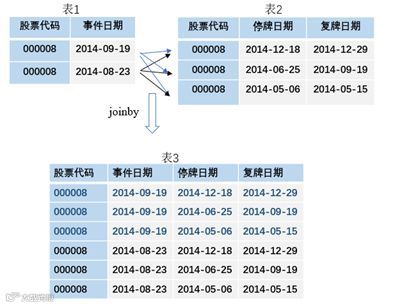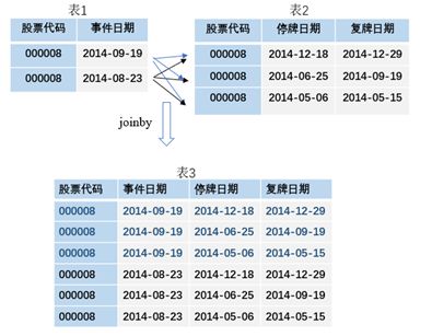 使用joinby命令,以股票代码为合并依据,将同一公司的每一事件发生日期与该公司所有停复牌日期数据行进行配对组合。