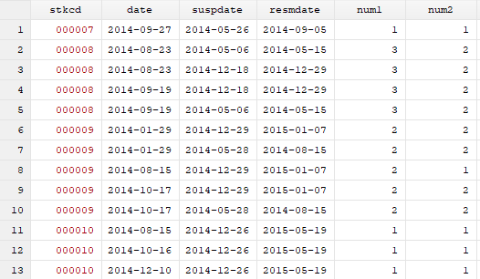 input str6 stkcd str15 suspdate str15 resmdate