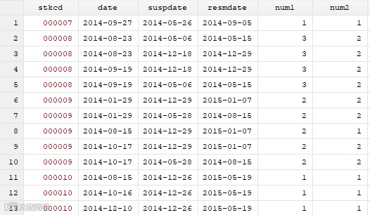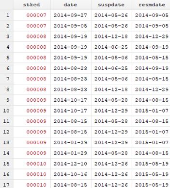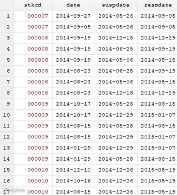 停复牌日期数据如下:suspdate表示停牌日期,resmdate表示复牌日期。