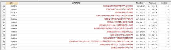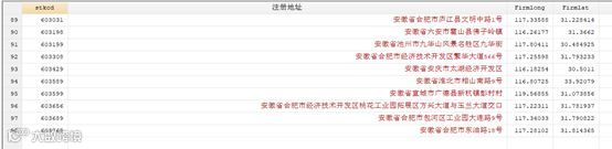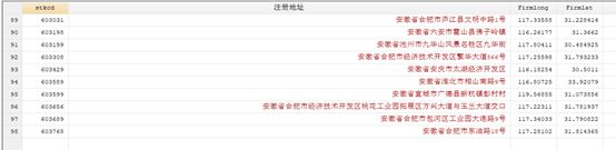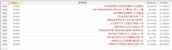 我们发现这里有3243家上市公司的注册地址经纬度。但是我们发现上市公司的注册地址在各个省都有,而我们只有安徽省内银行数据,所以我们需要保留注册地址中包含安徽的。
