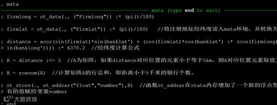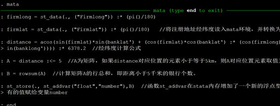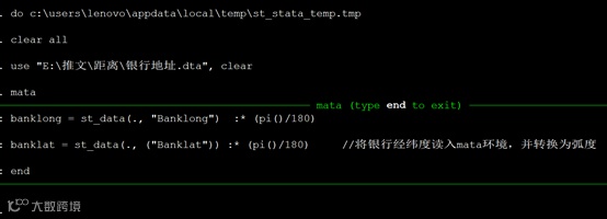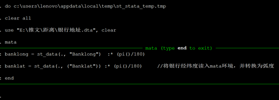 banklat = st_data(., "Banklat") :* (pi()/180) //将银行经纬度读入mata环境,并转换为弧度(公式需要)