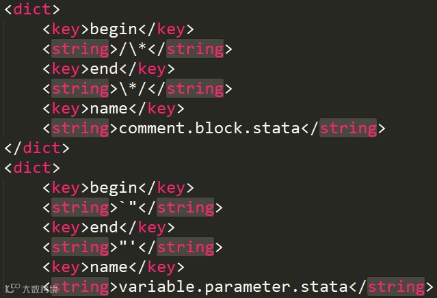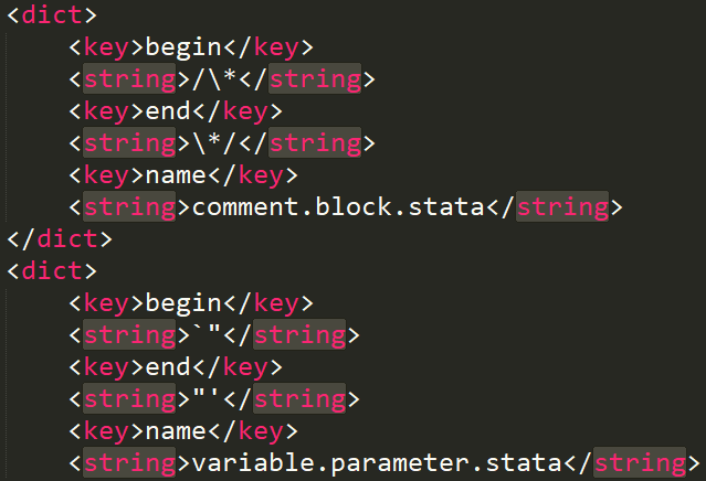 除了我们常用的“Ctrl+H”替换外,Sublime Text还有更方便的功能。我们以推文《想让谁亮,谁就亮!》中的“StataEditor.tmLanguage”文件为例,如果我们把光标放在“string”的开头或结尾处,然后按住Alt+F3(或Alt+Fn+F3),就可以同时选中所有的“string”并同时进行操作: