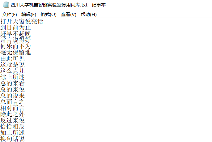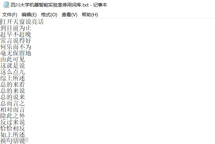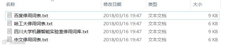 目前公认的停用词表有:百度停用词表,哈工大停用词表,四川大学机器智能实验室停用词表和中文停用词表。如图所示: