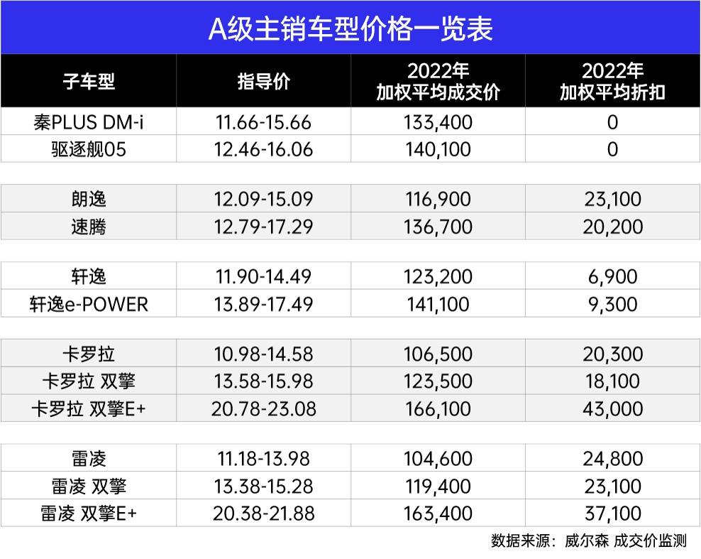 油电对价,市场竞争定位精准,品牌价值上升。在更为注重性价比被合资燃油车把持的紧凑型轿车市场,比亚迪秦PLUS DM-i定价11.66-15.66万元直接切入同级别燃油车价格带,降维打击同级别的轩逸、朗逸、卡罗拉、雷凌等传统合资大牌燃油车,且较同级PHEV价格下探8-9万元,完全改变了用户对于常规PHEV车型的价格预期。秦PLUS DM-i和驱逐舰05除国家补贴和免购置税外,终端基本没有折扣,而合资主销燃油车大多有2万元以上的折扣,这也使得秦PLUS DM-i和驱逐舰05的实际平均成交价位超过合资主销燃油车型,品牌价值进一步提升。