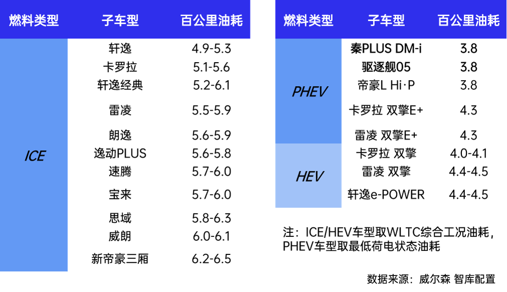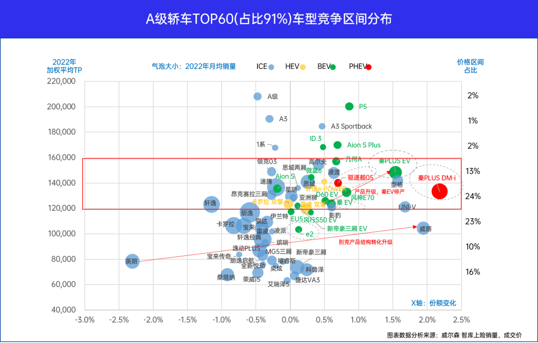 从威尔森销量分析的竞争区间分布图看,中国家轿市场主销价格区间集中在6-16万元,燃油车份额大片萎缩,新能源车加速扩张,价格区间上移,燃油车占领的12万元以下区间明显萎缩,传统强势车型朗逸、宝来、轩逸经典、卡罗拉、雷凌销量均出现两位数下滑,燃油车内部竞争激化。