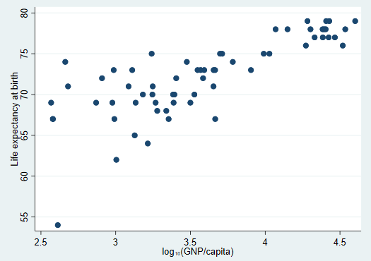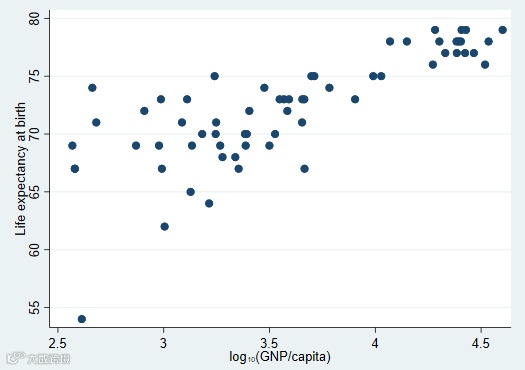 接下来我们再以lifeexp数据为例,绘制出人均国民生产总值与预期寿命的散点图。首先我们对gnppc(GNP per capita)取底数为10的对数,生成一个新的变量loggnp,然后绘制loggnp与lep(Life expectancy at birth)的散点图,具体程序如下:
