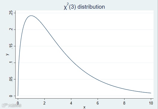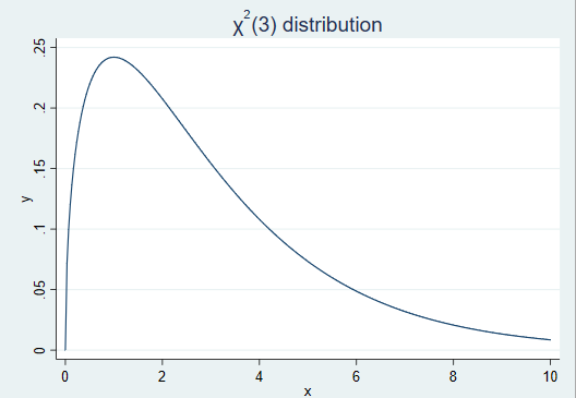 twoway function y = gammaden(1.5,2,0,x), range(0 10) title("{&chi}{sup:2}(3) distribution")