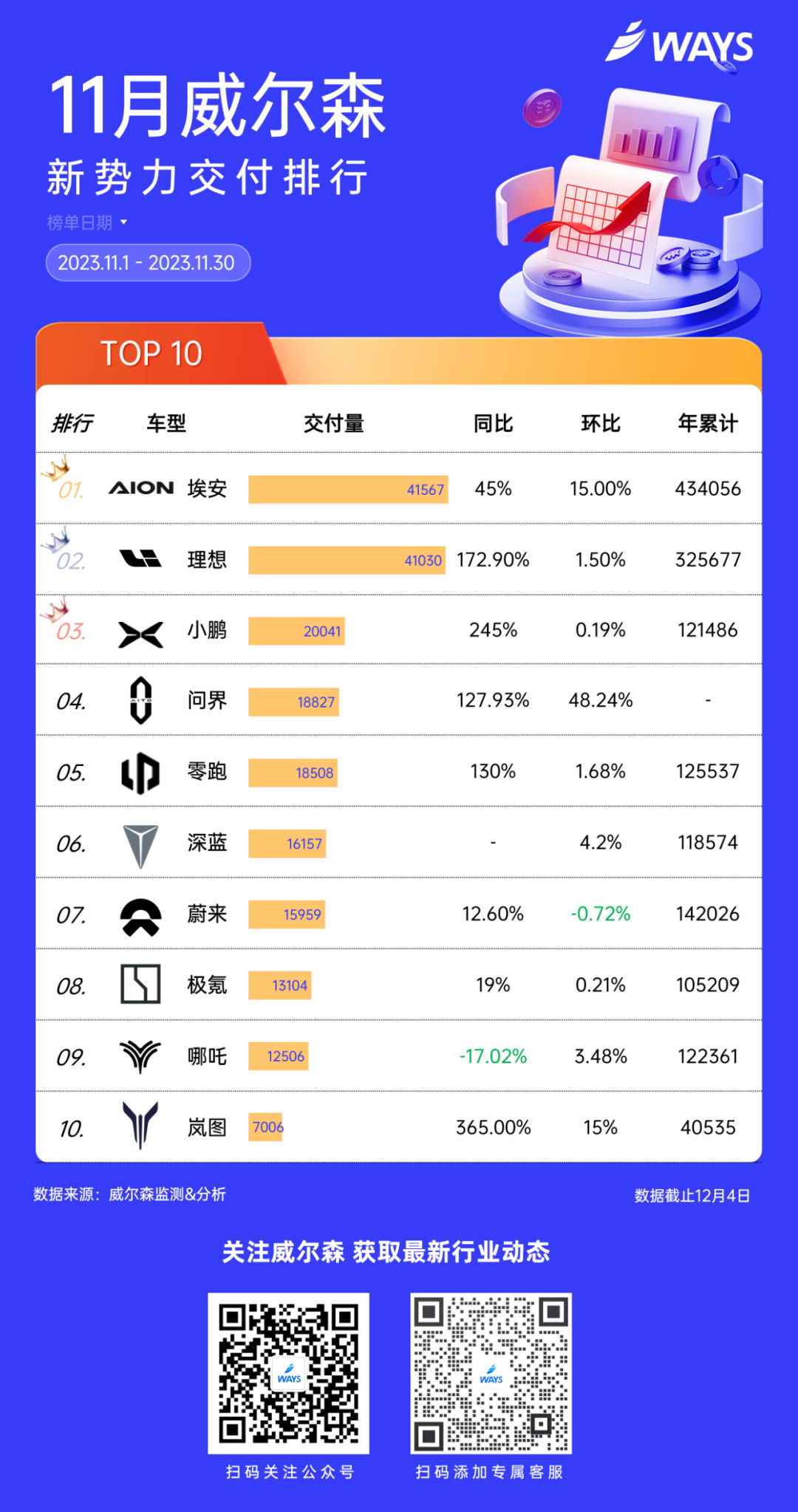 11月新势力销量快讯:理想提前达成目标,问界高调冲前三