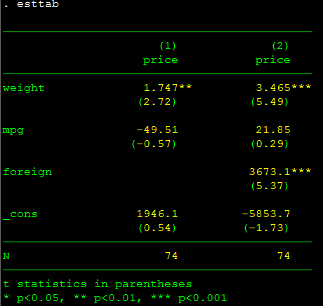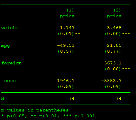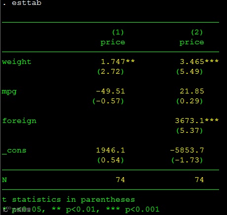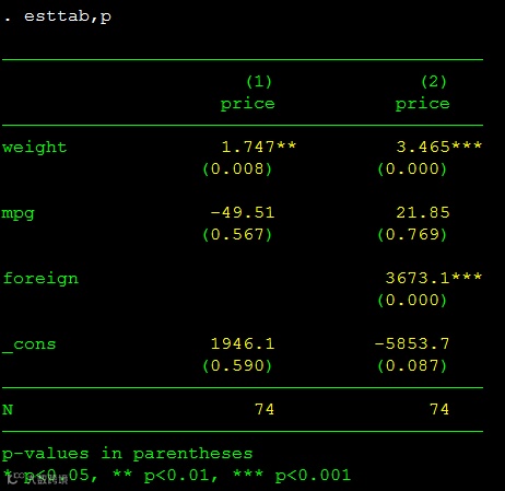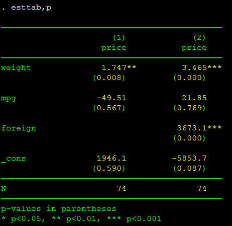 esttab m1 m2,p //括号内为p值,默认设置为保留三位小数