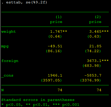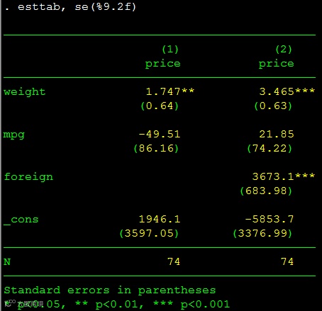 esttab m1 m2,se(%9.2f) //括号内为标准误,并且保留两位小数
