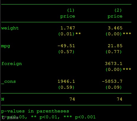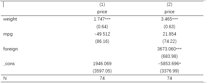 首先我们以auto数据为例,比如我们要用weight,mpg这两个变量来预测price,得到回归结果m1,然后再添加一个变量foreign来预测price,得到回归结果m2。