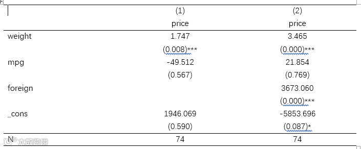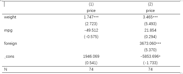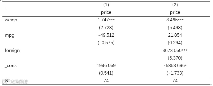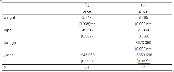 reg2docx相较于esttab,一个最明显的优点就是它可以直接将回归表输出到docx文档中。在这里,我们同样以auto数据为例。