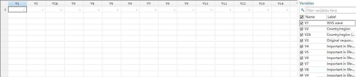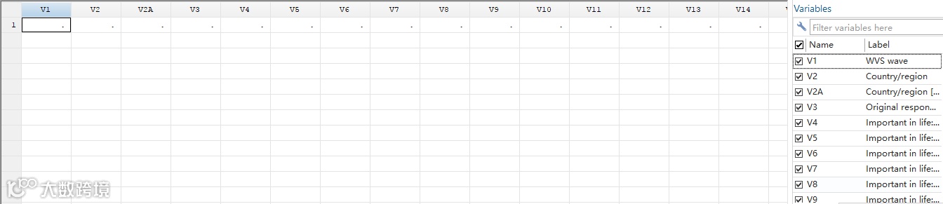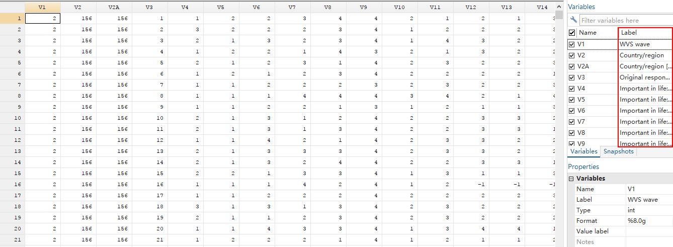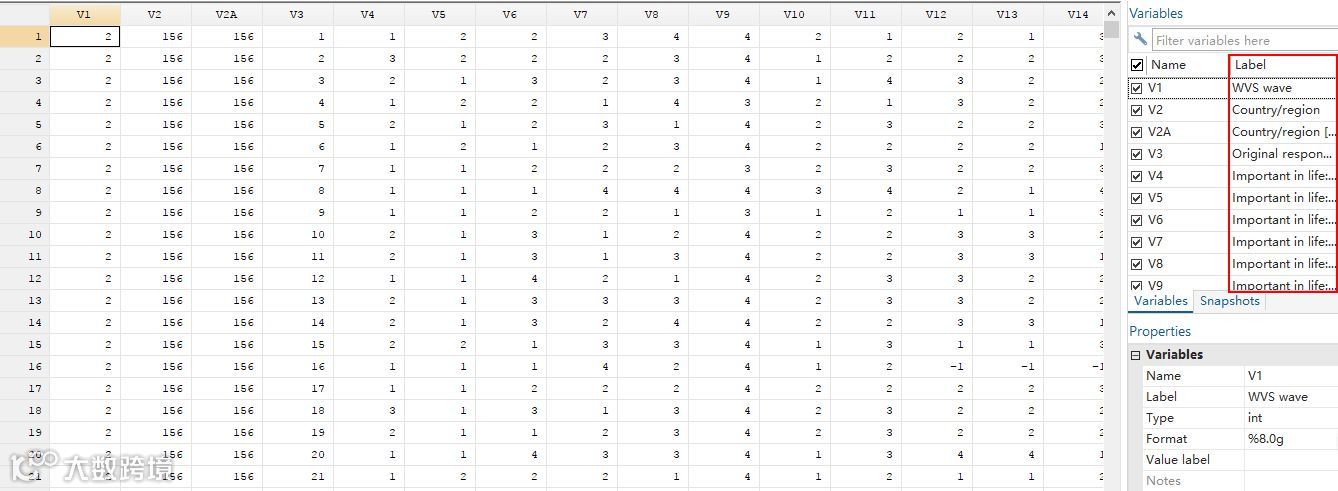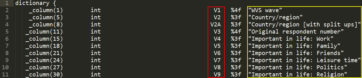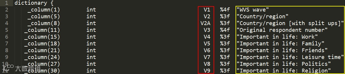 这个数据字典规定了开始的列数、存储的类型、变量名、读取格式以及变量的标签,我们来教大家看懂这个字典。这里,用红色框起来的是变量名,用黄色框起来的是相应变量的标签,变量名和标签中间的一列是相应的数值显示格式。现在我们来看第2行,最左边的一列显示“_column(1)”,格式一列显示“%4f”,变量名为“v1”,标签为“WVS wave”,数值型变量存储的类型为“int”,所以第2行指的就是指定标签为“WVS wave”的变量“v1”是.dat文件中从第1列开始长度为4的数值,即下图中的“2”为v1的第一个观测值: