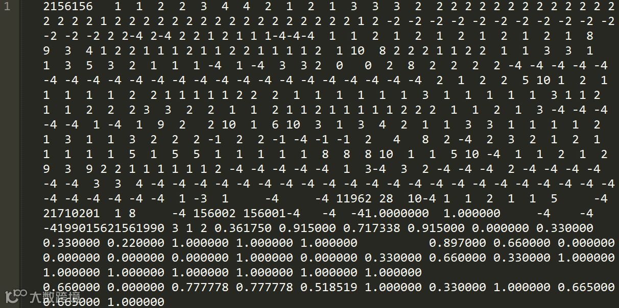 以1990年的世界价值观调查数据为例,让我们来瞄一瞄这些.dat文件的第一行数据(数据链接:https://raw.githubusercontent.com/Stata-Club/Sharing-Center-of-Stata-Club/master/article/WV2_Data_China_1990_stata_v_2015_04_18.dat):