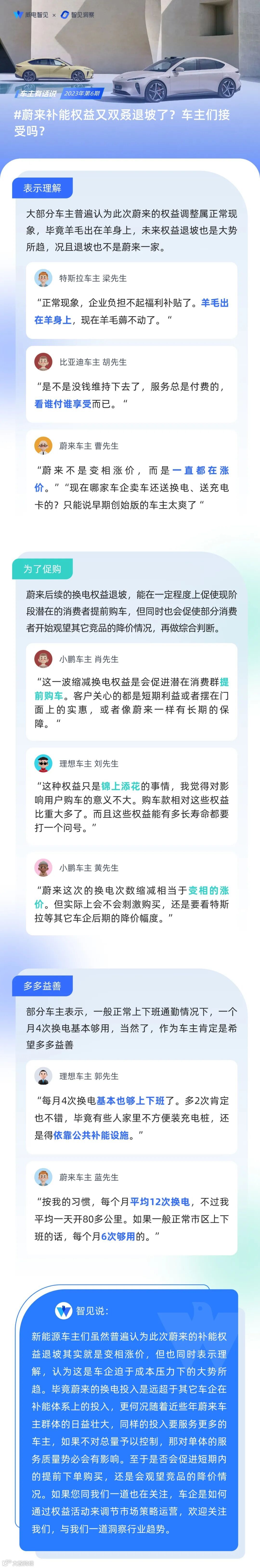行业分析师认为:这或与4月10日蔚来宣布将对车主权益再度进行的调整有关,从6月1日起,对新购买ET7、EC7、ES7和ET5的用户,不再赠送免费家充桩,免费换电次数也统一降为每月4次。而蔚来从一开始的免费无限次换电,到后来每月免费换6次(保留家充桩)或4次(放弃家充桩),再到本次调整后的统一每月4次。