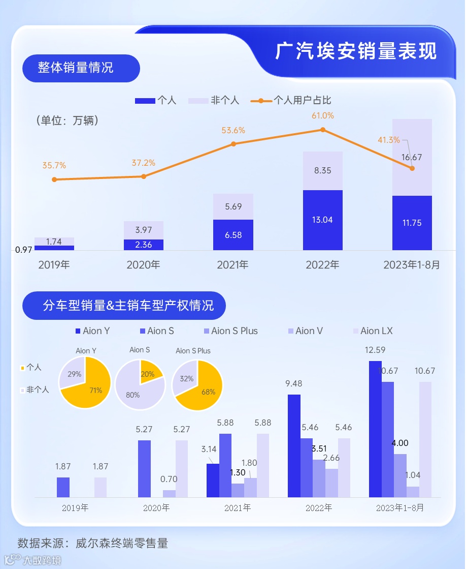 当前广汽埃安在终端市场的表现类似新能源发展早期的比亚迪:B端用户占比过半。与比亚迪不同的是,埃安品牌的B端渠道高度依赖广汽集团的自营网约车平台如祺出行,平台的发展情况将很大程度影响埃安今后在网约车市场的扩容。为了扩大品牌在出行市场的容量,埃安同时联合滴滴出行布局自动驾驶出行服务。