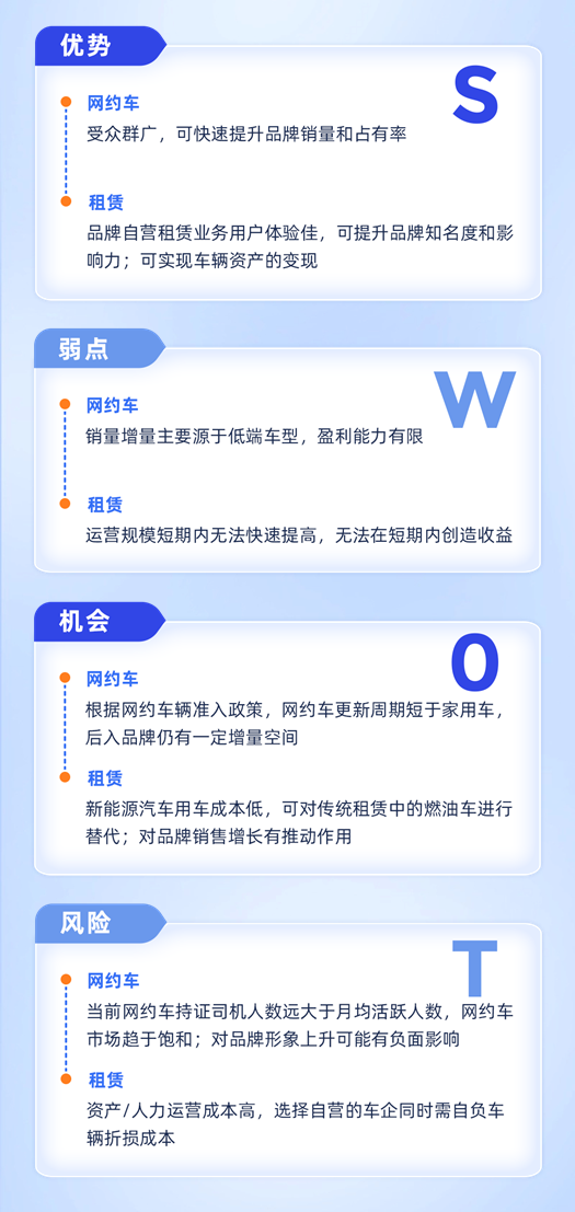当前国内新能源汽车销量与渗透率处于快速增长期,部分新能源品牌为了扭转品牌声量不足、渠道覆盖不广等弱势,布局出行市场以传播品牌、提振销量。但对于盈利能力相对较弱的品牌,重资产投入出行业务的回报仍存在不确定性,如何从收益及风险中取得平衡,是新能源品牌进入出行市场前需要重点思考的问题。